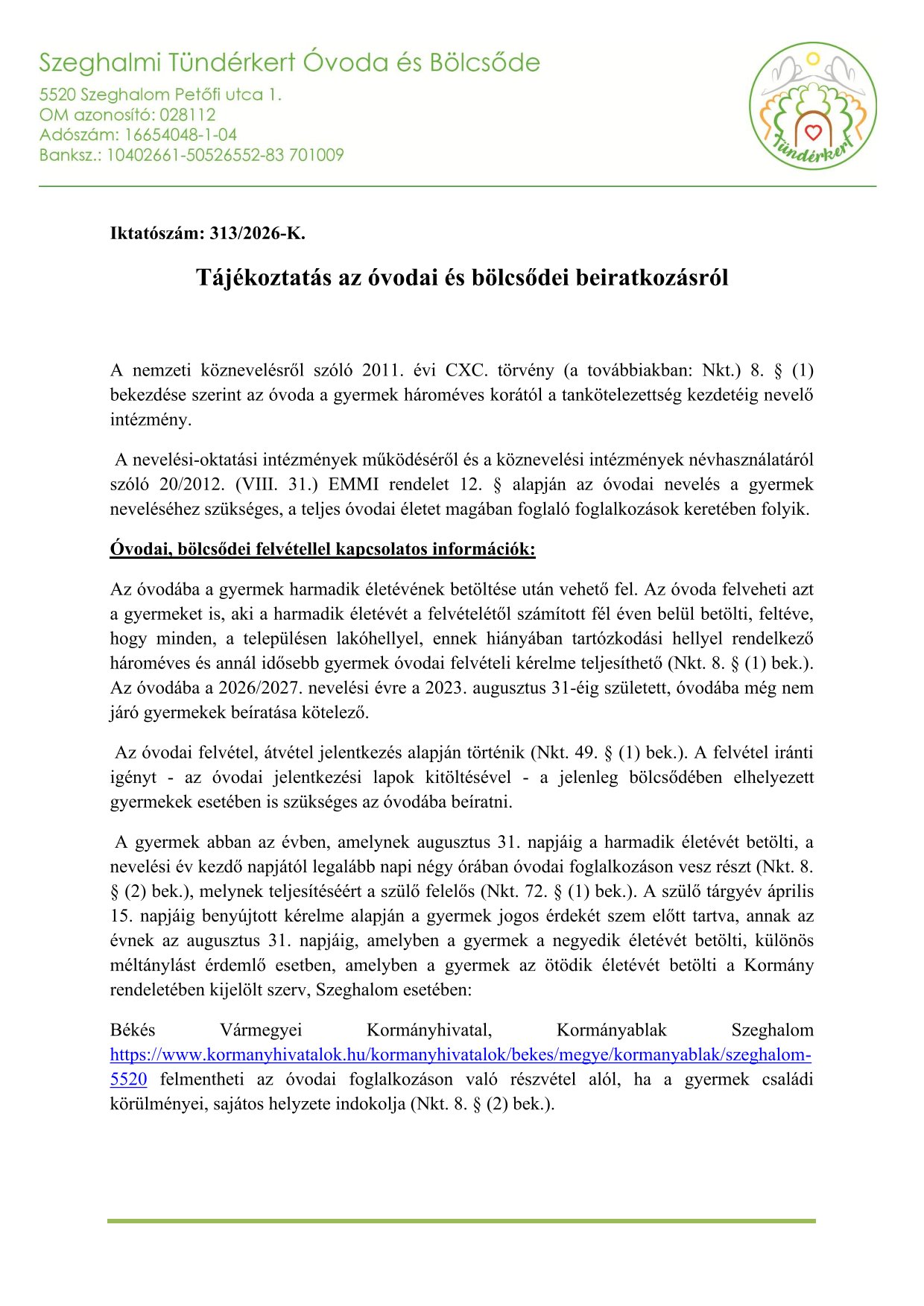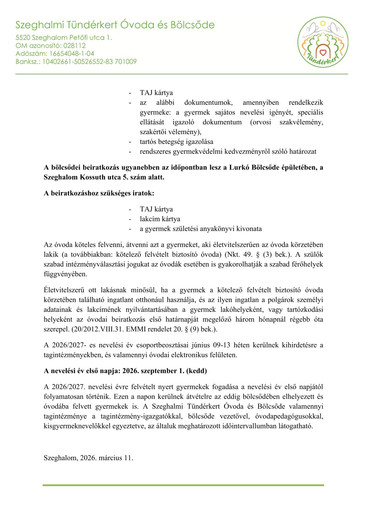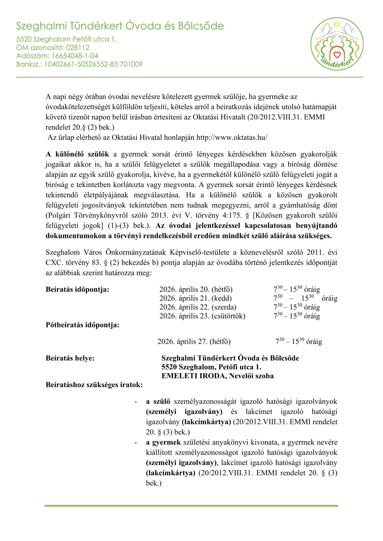Óvodai és Bölcsődei beiratkozás